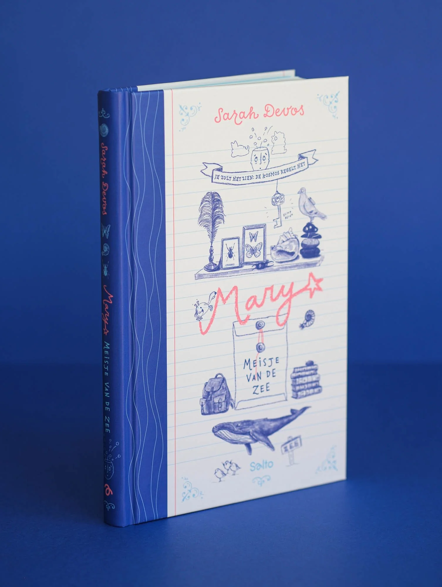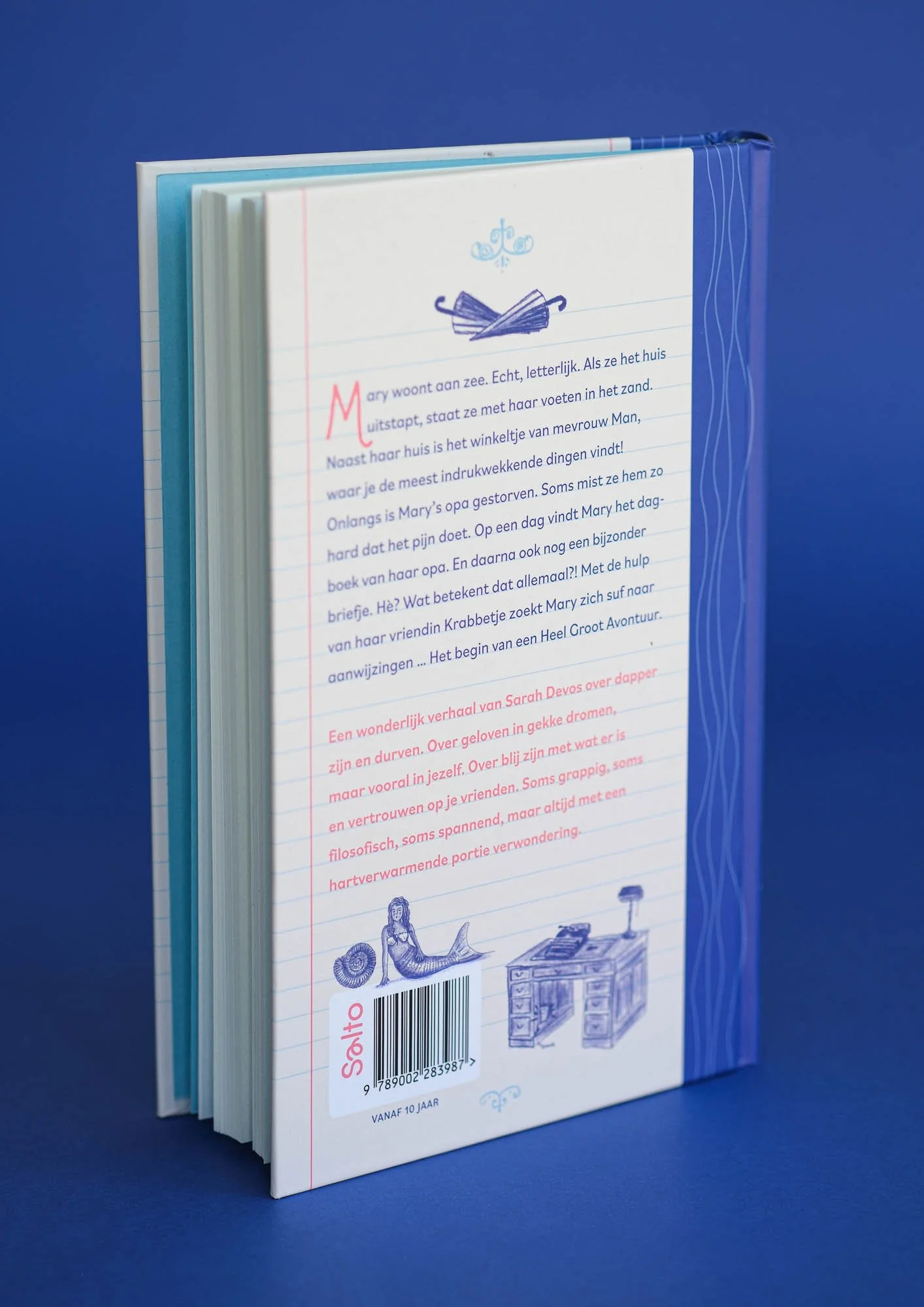 Voor de titel kozen we een extra PMS-kleur die helder contrasteert met het blauw van de illustraties. Binnenin opent het boek met een Celeste-blauw schutblad uit de Sirio Color-reeks van Fedrigoni, en zowel tekst als illustraties in het binnenwerk werden in PMS-blauw gedrukt. Mary verscheen bij Salto Uitgeverij en richt zich tot jonge lezers van 7 tot 12 jaar.