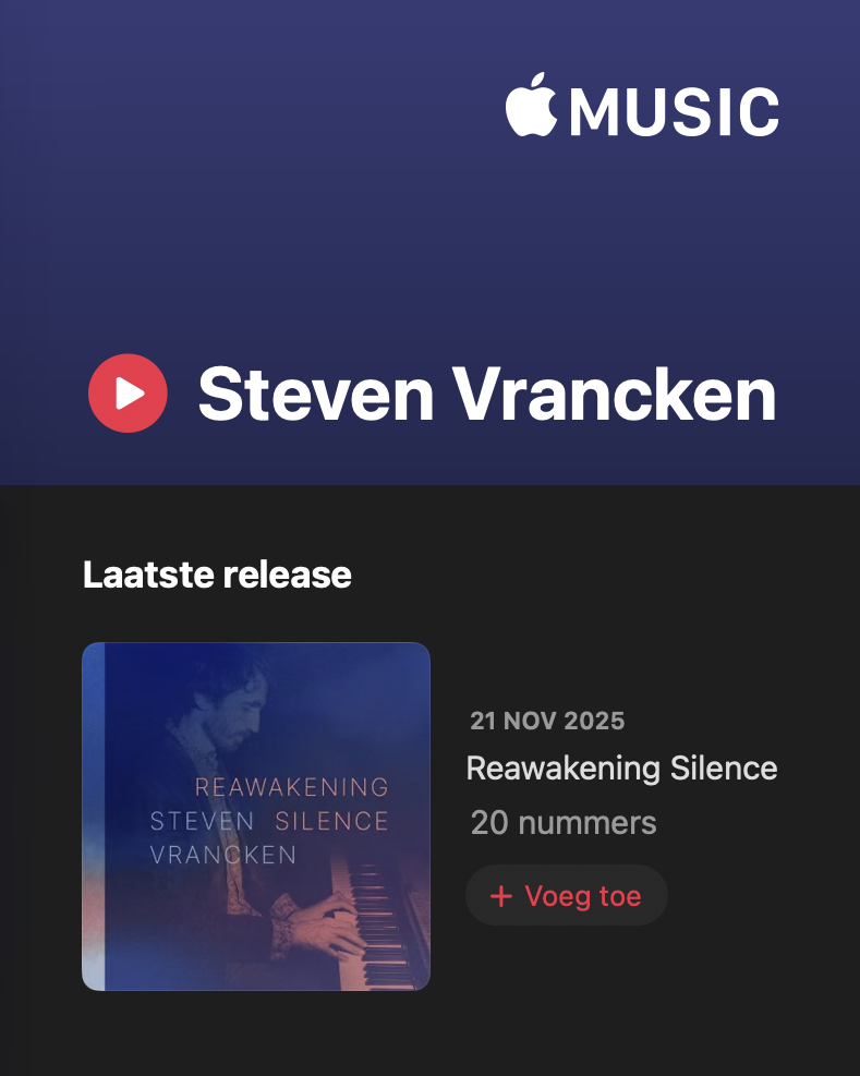 Steven Vrancken is een autodidact componist en pianist die stilte, emotie en eenvoud vertaalt naar neoklassieke muziek met een meditatieve kracht. Sinds 2011 werk ik met hem samen aan de vormgeving van zijn albums, telkens met oog voor de verstilling, emotie en gelaagdheid die ook in zijn muziek doorklinken. Hieronder vind je drie recente projecten: het best-of-album Reawakening Silence, het pianoalbum Emergence (2025) en het dubbelalbum In Between uit 2019.