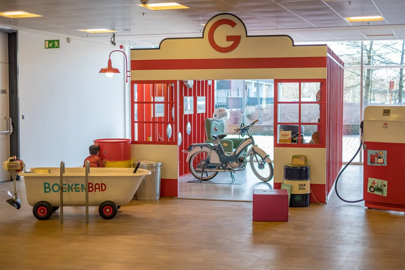Een andere eye-catcher in de tentoonstelling de garage van Gust die, afgezien van zijn hoogte, sterk lijkt op de garage uit het prentenboek. En net als in het verhaal, ligt de werkplaats van Gust vol attributen zoals oude banden, olievaten, velgen, een oude koelkast, een werkbank en zelfs een badkuip. Sommige objecten bevatten zelfs een verrassing: wanneer je de telefoon van Gust oppakt, op een knop op zijn radio drukt of in zijn favoriete stoel zit en zijn helm draagt, klinkt er een stem die je een verhaal vertelt. Er is ook een bad op wielen waarin je een boek kan lezen, een coole vintage scooter om op te klimmen en een speciaal olievat. Wanneer je op de knop drukt en door het kijkgat van het olievat kijkt, zie je de auto's uit het prentenboek rondcirkelen.